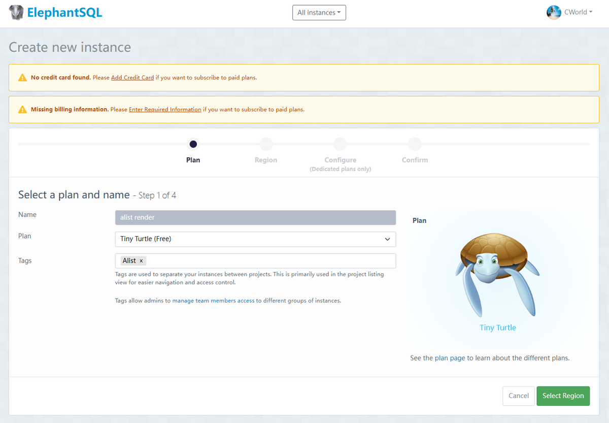 Alist 需要一个数据库,可选 sqlite3、mysql、postgres。这里选用提供免费服务的 ElephantSQL ↗。