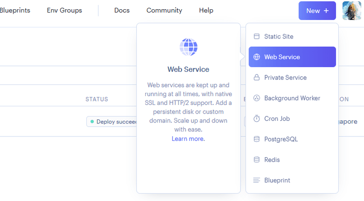 注册完成后,点击右上角的 New +,选择 Web Service,并在授权 Github 时连接刚刚 Fork 的 Alist 仓库。
