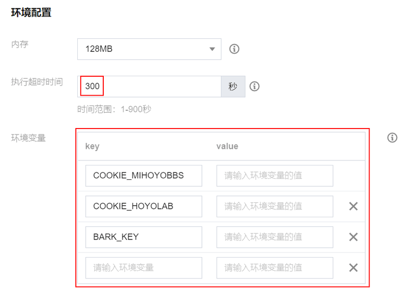 v1.5.0+版本增加了随机延迟功能,默认为 10-300s。故云函数的执行超时时间应设置为大于变量中的MAX_SLEEP_SECS(最大休眠秒数)。