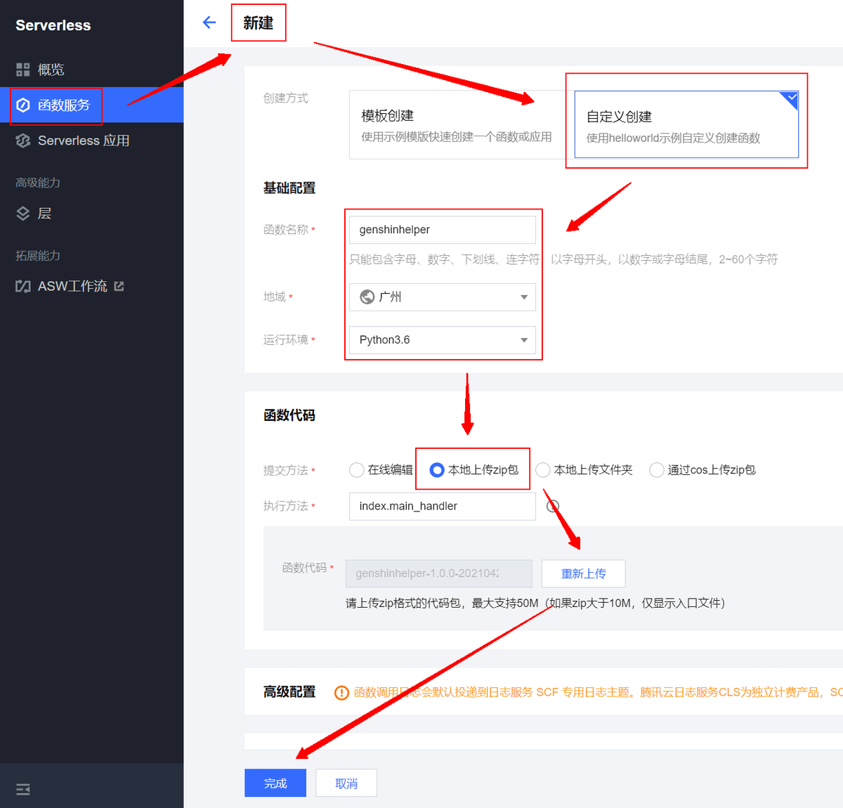 前往 云函数 SCF 管理控制台 ↗ —>函数服务—>新建—>自定义创建—>基础配置—>本地上传zip包—>上传—>本地上传zip包—> 选择下载的genshinhelper-xxx-serverless.zip压缩包—>完成