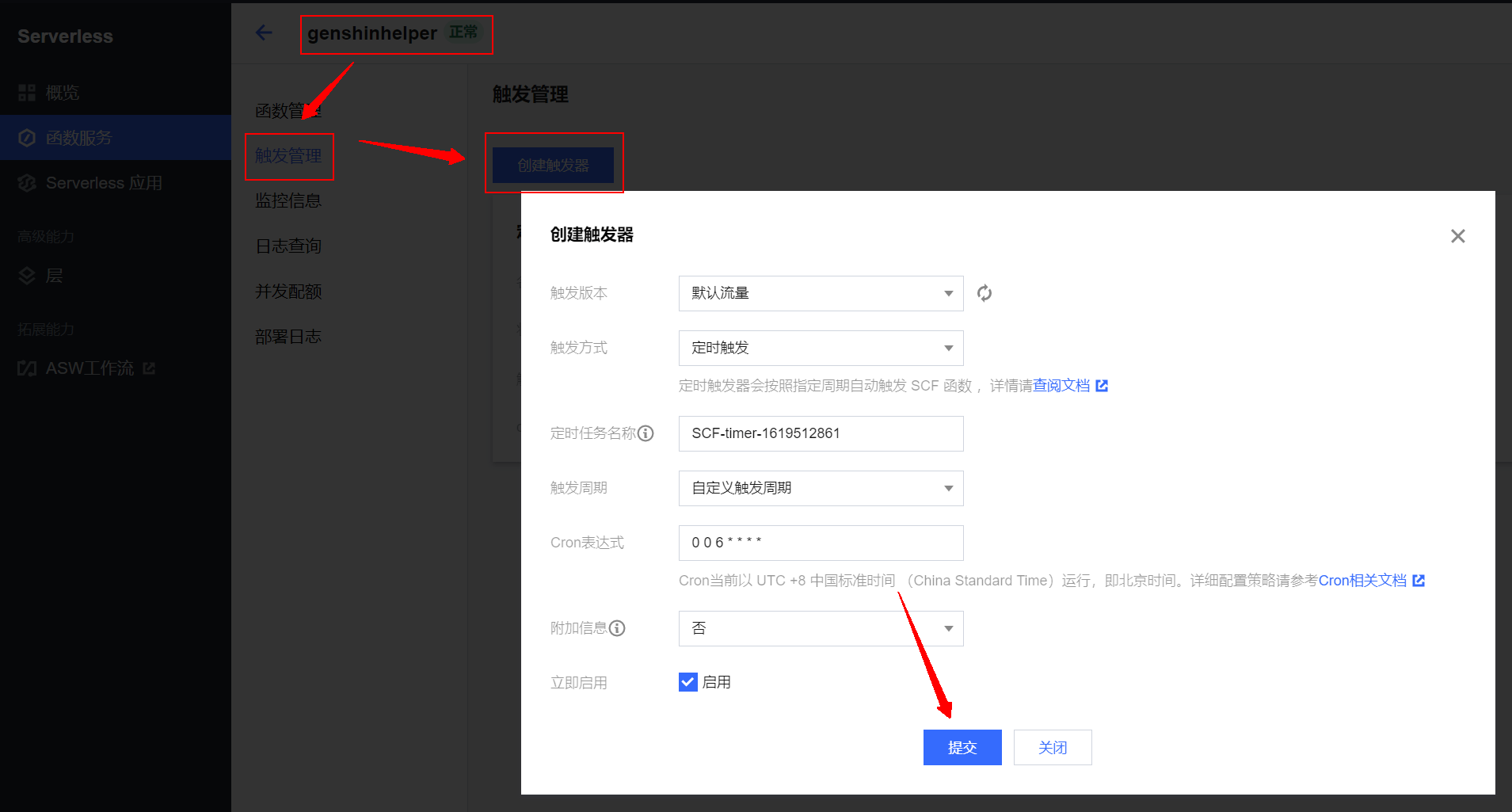 前往genshinhelper—>触发管理—>新建触发器—> 按下图进行配置。当然你也可以添加一个 API 网关,方便手动强制执行。